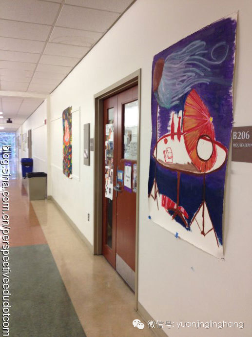 英语教室的外面都贴着课上学习内容相关的绘画。帮助学生加强学习的趣味性。